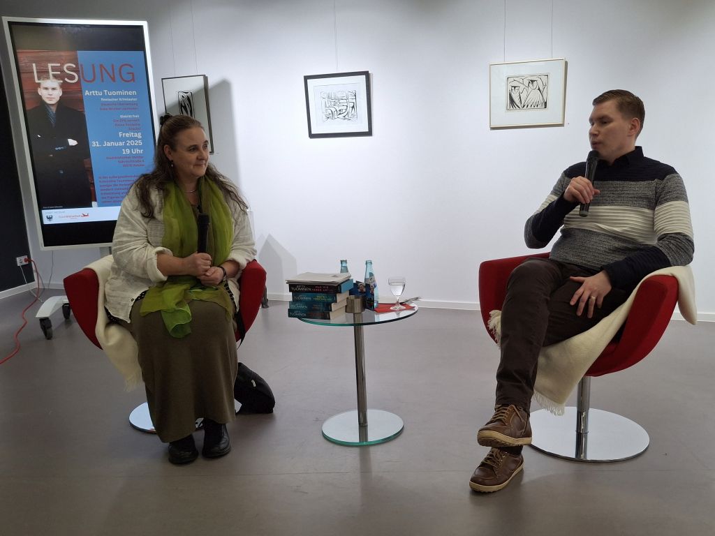 Nach der Begrüßung durch die Vorsitzende der Bezirksgruppe Gießen/Wetzlar, begann Anke Michler-Janhunen den Abend mit einem Interview, in dem sie Arttu Tuominen befragte, wie er zum Schreiben kam und was seine Bücher ausmacht. Anschließend wurde der Prolog des vierten Buches “Was wir ihnen antun” zunächst von Arttu auf finnisch vorgelesen und anschließend von Anke ins Deutsche übersetzt. Für einige Zuschauer war es dabei das erste Mal, dass sie die finnische Sprache hörten. In dem Buch geht es um die 13jährige Laura, die verschwindet und von ihrer Familie als vermisst gemeldet wird. Die Polizei geht zunächst nicht von einem Verbrechen aus, sondern glaubt, dass das Mädchen nur von zuhause weggelaufen ist. Erst als die Polizei Nachrichten eines “Peter Pans” auf Lauras Rechner findet, klingeln die Alarmglocken. Kurz danach wird das Mädchen tot aufgefunden. Natürlich wurde nicht verraten, wie sich die Geschichte entwickelt, ob es weitere Tote gibt und der Mörder gefasst wird.