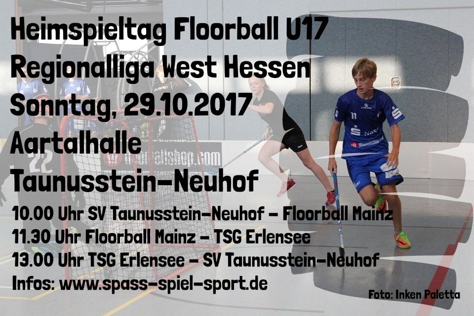 Die Floorballer des SV Taunusstein-Neuhof starten in der Saison 2017/2018 mit 4 Teams in den Alterklassen U11, U13, U15 und U17 in der Floorball-Regionalliga West Hessen und laden die DFG-Mitglieder und alle interessierten Erwachsenen, Jugendlichen und Kinder zu den Heimspieltagen in die Aartalhalle Neuhof ein: