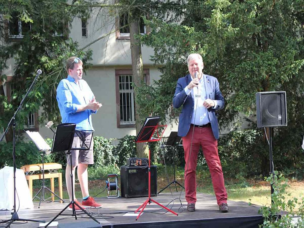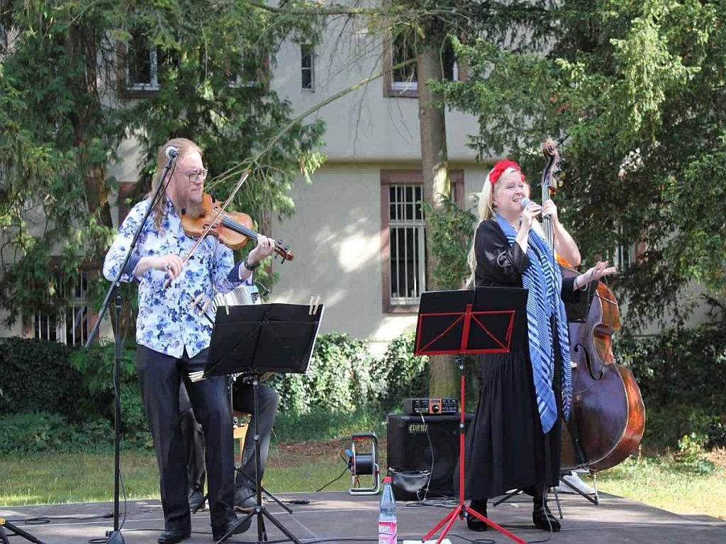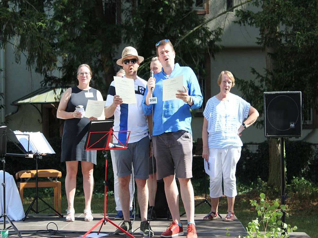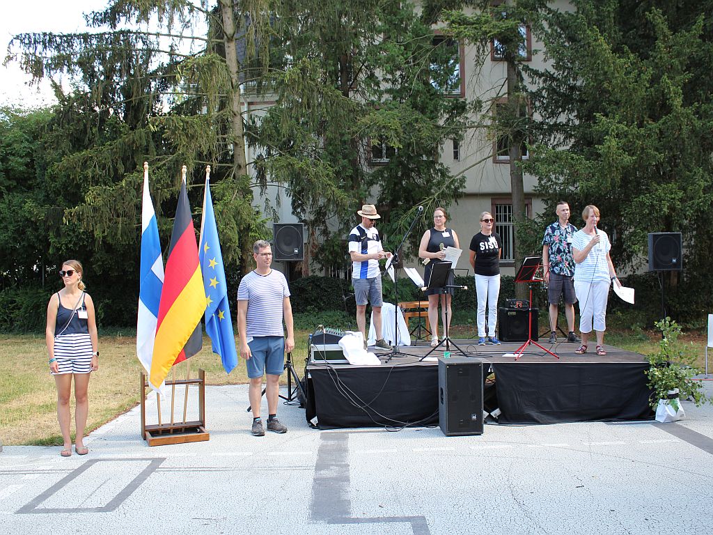 Für tolle Finnlandstimmung sorgten ein kleines Juhannusfeuer in der Feuerschale, finnische Gaumenfreuden wie hausgebackene Korvapuustit, leckere Kuchen, Würstchen mit Senf aus Turku und finnische Getränke wie der Original Lonkero sowie Sängerin Laura Ryhänen und ihre Band Uusikuu mit einem bunten Mix aus finnischer Tanzmusik der 1930er bis 1960er-Jahre. Zu Tango in Moll und Humppa wurde fleißig das Tanzbein geschwungen und im Anschluss an das Konzert auch in gemütlicher Runde gemeinsam finnische Lieder gesungen.