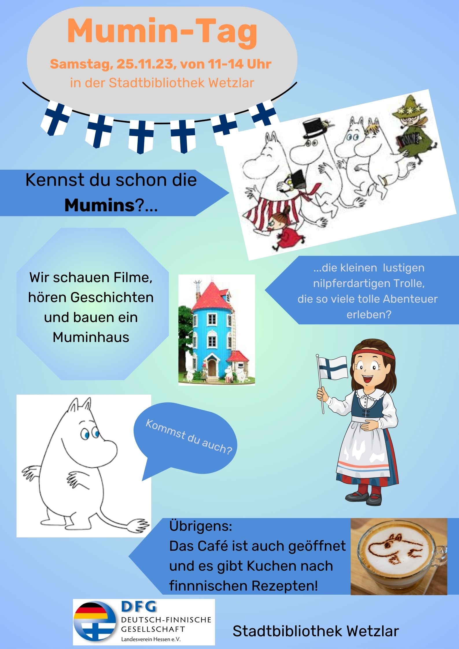 Wir malen und basteln mit den Kindern ein Muminhaus, lesen Geschichten rund um die Mumins und sehen einen Film. Für das leibliche Wohl ist gesorgt. Im Café können sich auch die Erwachsenen bei Kaffee und finnischem Kuchen die Zeit verteiben. Außerdem können die Finnlandfotos von Reiner Leopold im 1. Stock besichtigt werden.