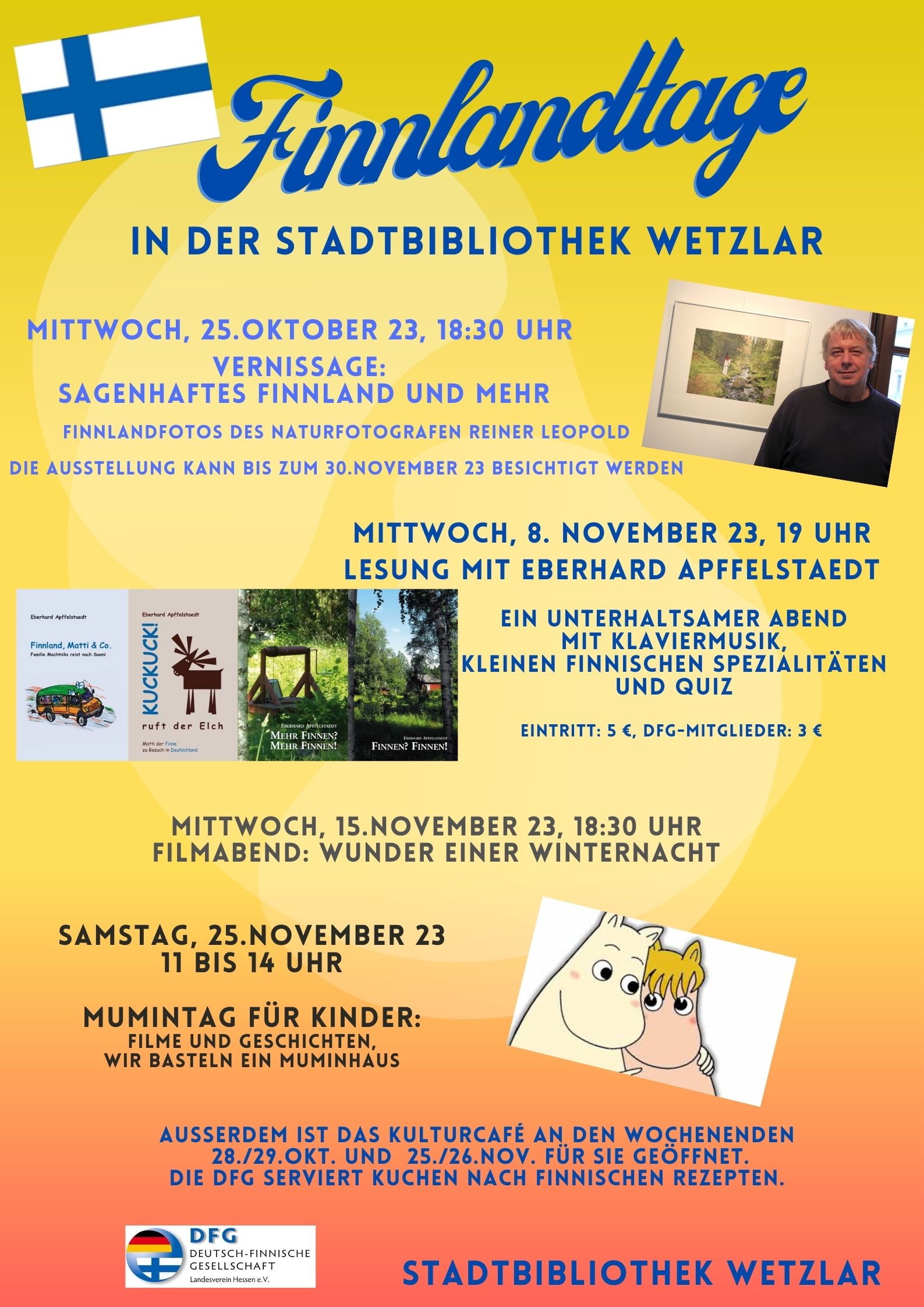 Anlässlich des 50. Jubiläums der Deutsch-Finnischen Gesellschaft Hessen e.V. (DFG) hat die Bezirksgruppe Giessen/Wetzlar in Zusammenarbeit mit der Stadtbibliothek Wetzlar für Oltober/November 2023 ein buntes, abwechslungsreiches Programm zusammengestellt. Freuen Sie sich auf tolle Fotos aus Finnland, eine kurzweilige Lesung mit dem Finnbuchautor Eberhard Apfelstaedt, den weihnachtlichen Familienfilm “Wunder einer Winternacht” und einen Tag für Kinder, der ganz im Zeichen der finnischen Trollfamilie “Die Mumins” steht.