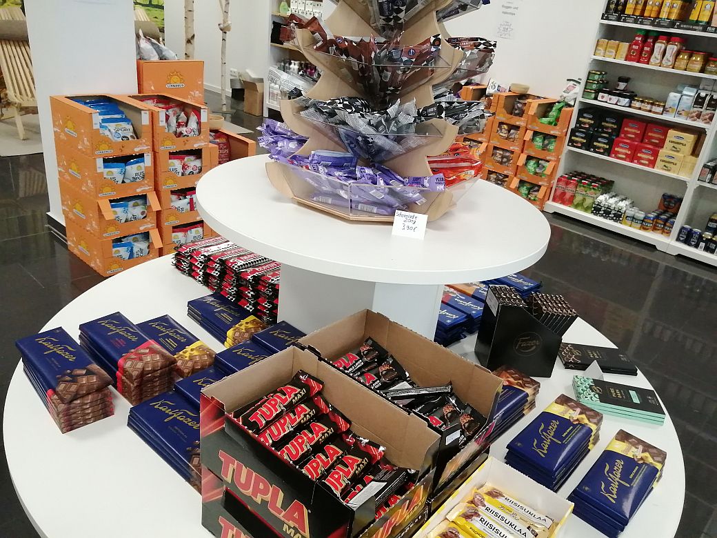 Danach begeben wir uns auf Entdeckungsreise und Shoppingtour. Alles können wir nicht aufzählen, dazu gibt es zu viele Artikel. Für uns wichtig ist die Schokolade von Fazer, von der es reichlich Auswahl gibt. Auch Kekse, Lakritz und verschiedene Pastillen findet man. Finnischen Kaffee, den leckeren Frühstücksbrei und Dosen mit Rentier- oder Bärenfleisch erblicken wir ebenso wie mehrere Sorten finnischen Senfs. Natürlich sind auch Artikel rund um die Sauna verfügbar und viele Getränke. Koskenkorva, Minttu, Salmiakki und verschiedene Sorten finnischen Bieres runden das Angebot ab.