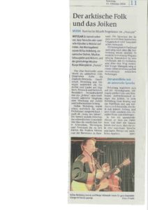 arktischer Folk Zeitungsartikel aus der Wetzlarer Neuen Zeitung zum Konzert von Niilas Holmberg und Roope Mäenpää
