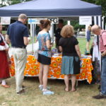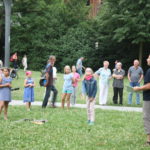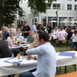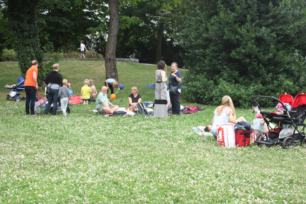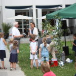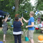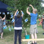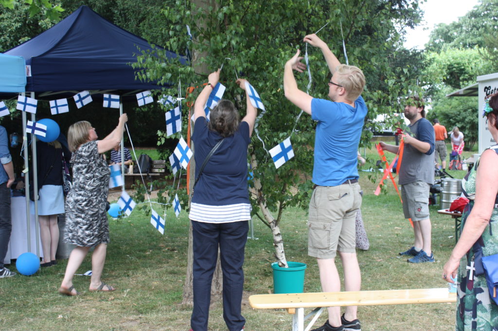 Wie es sich für ein richtiges nordisches Fest gehört, wurde zunächst eine “Birke” feierlich mit Bändern und finnischen Flaggen geschmückt. Auch wenn es nur einige große Zweige waren, die um einen Ahornbaum drapiert wurden, freuten sich die Finnlandfreunde über ihr Mittsommerbäumchen!
