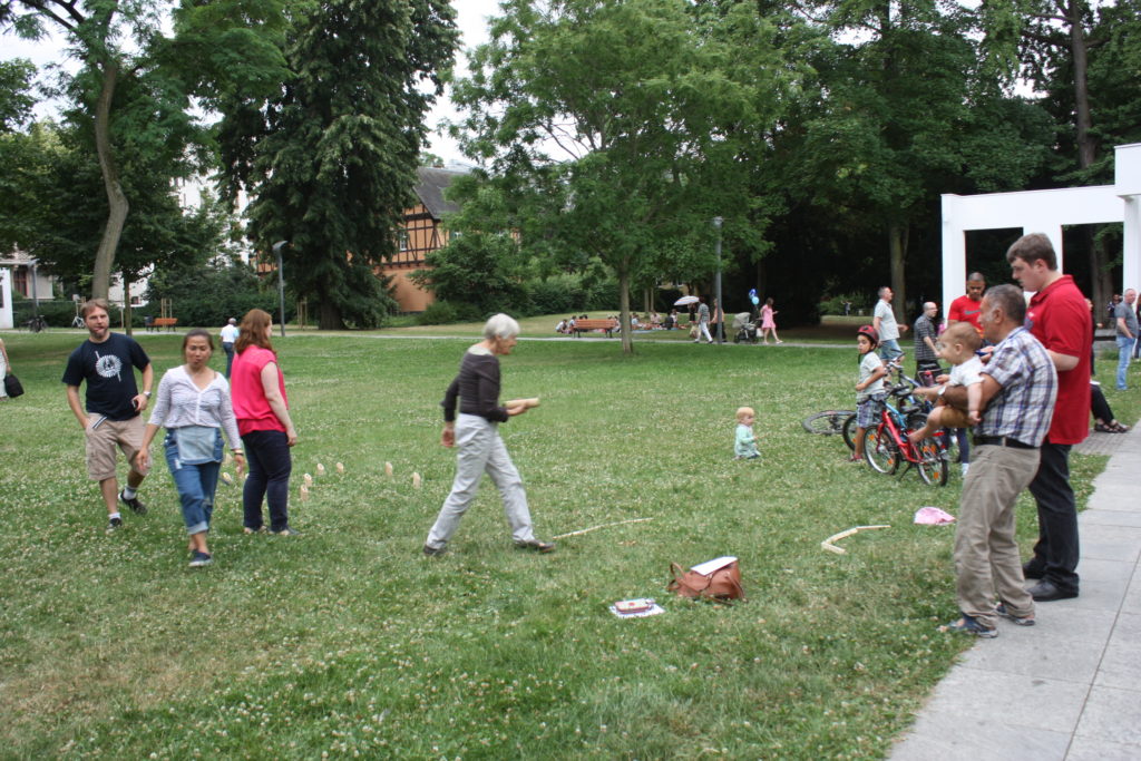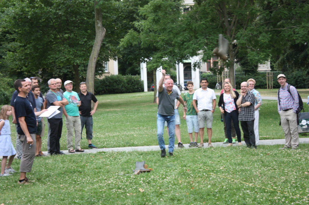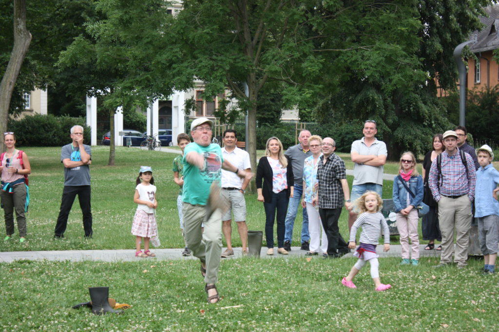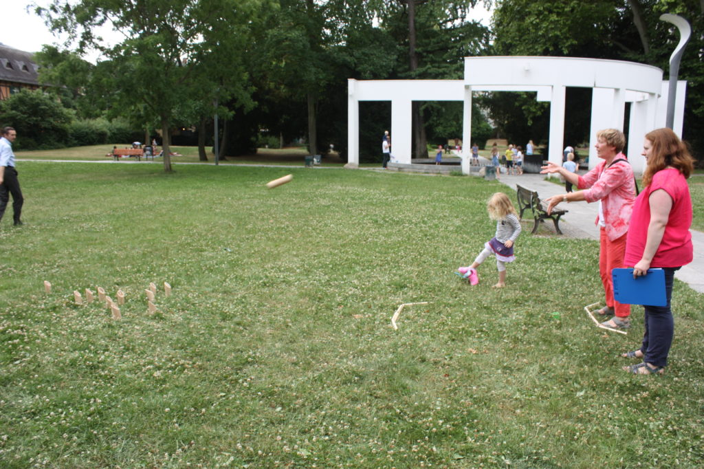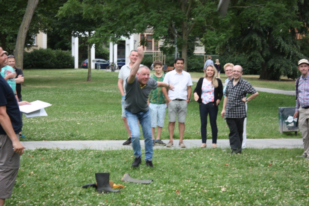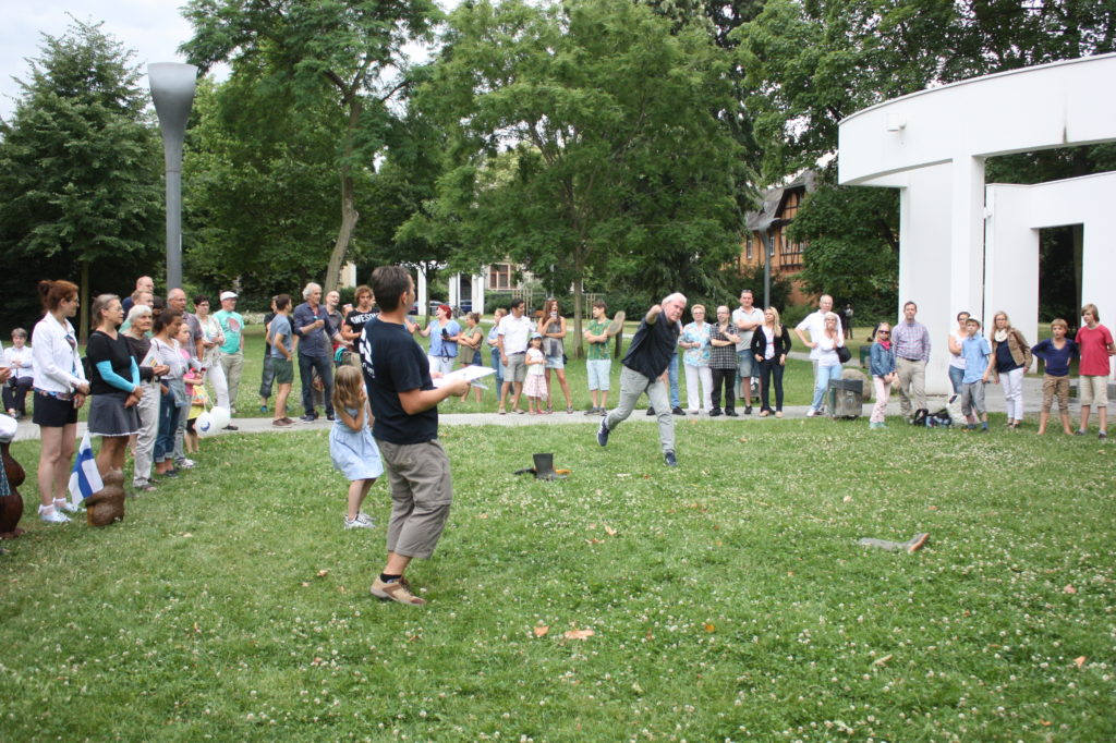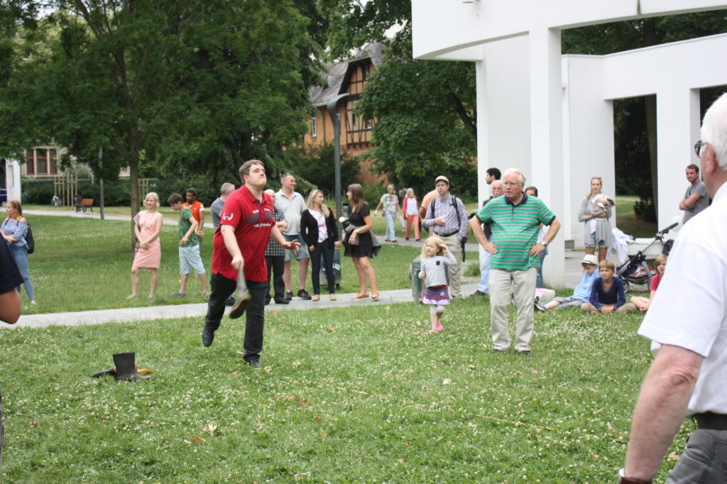 Was wäre ein finnisches Sommerfest ohne irgendwelche mehr oder weniger verrückten Wettbewerbe? Und so gab es auch in Frankfurt die Möglichkeit, das beliebte finnische Wurfspiel Mölkky auszuprobieren oder sich im Gummistiefelweitwurf zu messen. Hier herrschte großer Andrang in den drei Kategorien: Kinder, Frauen und Männer. Bei den Männern warf der Sieger stolze 25 Meter weit, was die große Zuschauerschar kräftig beklatschte!