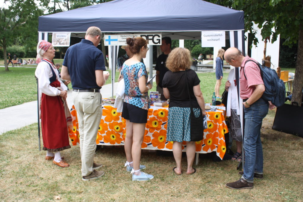 Die DFG Hessen hatte einen Stand aufgebaut, an dem sich Interessierte über Finnland und die DFG informieren konnten. Verschiedene Broschüren und Bücher waren ebenfalls erhältlich. Bei der Finnisch-Deutschen Handelsgilde gab es ein Finnlandquiz mit zum Teil kniffligen Fragen zu lösen. Sisu-Radio, die finnische Schule und die finnische Kirchengemeinde in Frankfurt boten an ihren Ständen Kaffee und Kuchen sowie finnische Stoffe an.