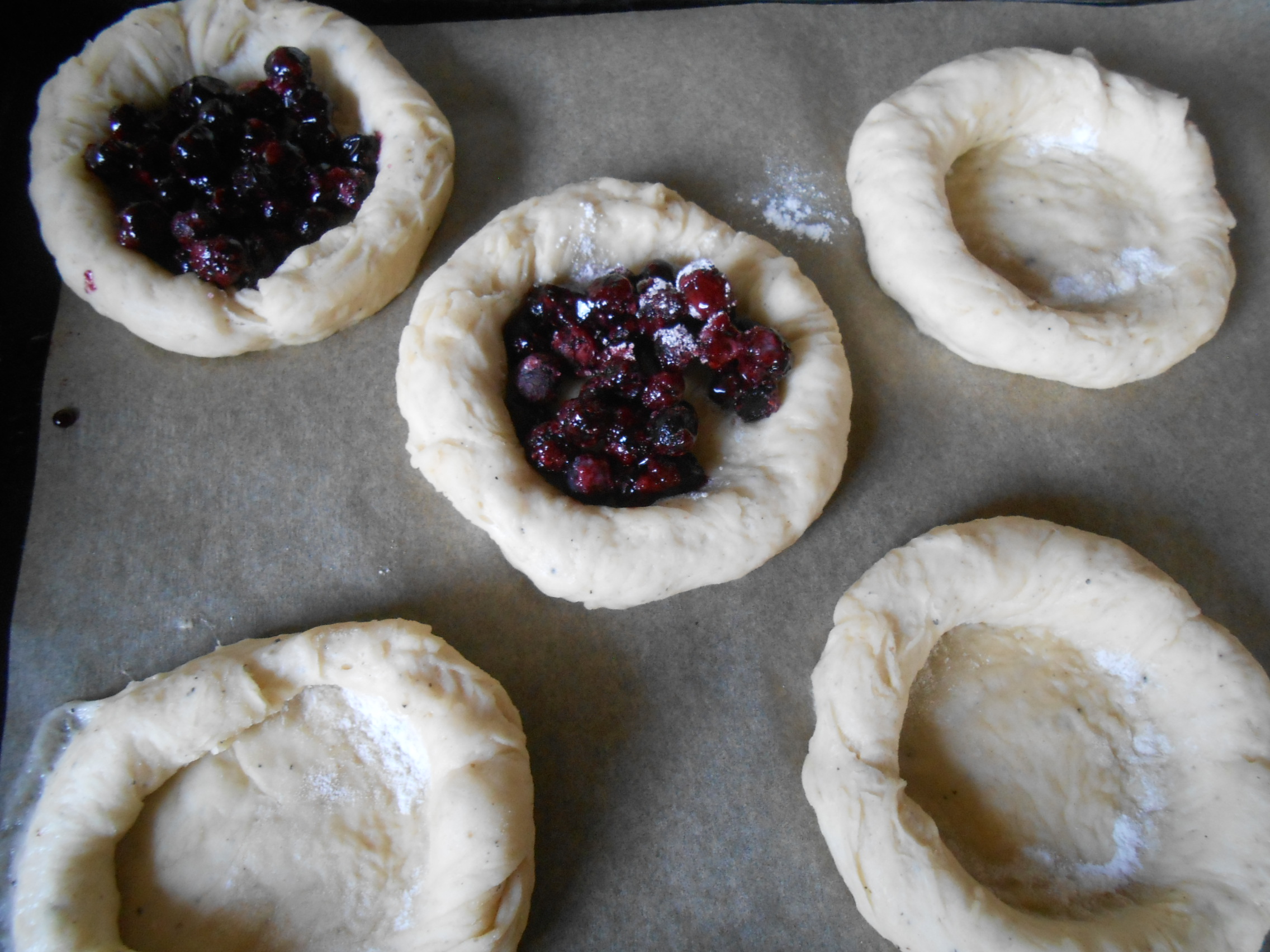 Blaubeerteilchen G.Bernhardt: Die Hefeteilchen auf ein Backblech legen, mit einem Glas eine Vertiefung eindrücken und mit Blaubeeren füllen
