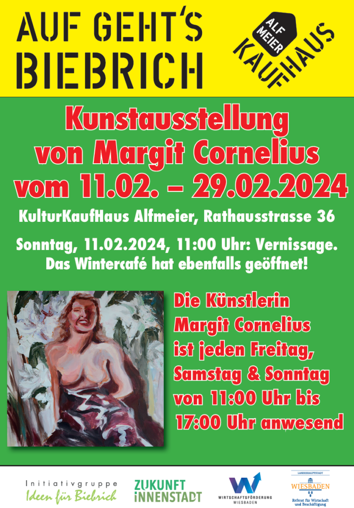 Die in Finnland geborene Margit Cornelius eröffnet am Sonntag, dem 11. Februar 2024, um 11 Uhr ihre Kunstausstellung im Kulturkaufhaus Alfmeier in Wiesbaden-Biebrich.
