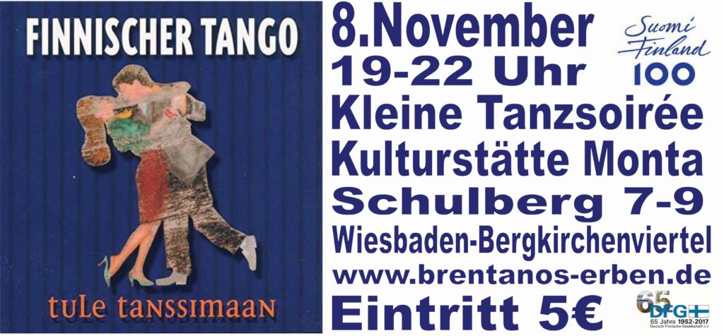 « Alle Veranstaltungen Diese Veranstaltung hat bereits stattgefunden. Finnischer Tango in Wiesbaden 8. November 2017 @ 19:00 - 22:00 Euro5,00 « Stammtisch in Darmstadt Stammtisch in Schotten » Kleine Tanzsoiree/Finnischer Tango Zum Kalender hinzufügen Google Kalender iCalendar Outlook 365 Outlook Live Details Datum: 8. November 2017 Zeit: 19:00 - 22:00 Eintritt: Euro5,00 Veranstaltungsort Kulturstätte Monta Schulberg 7-9 Wiesbaden, Google Karte anzeigen