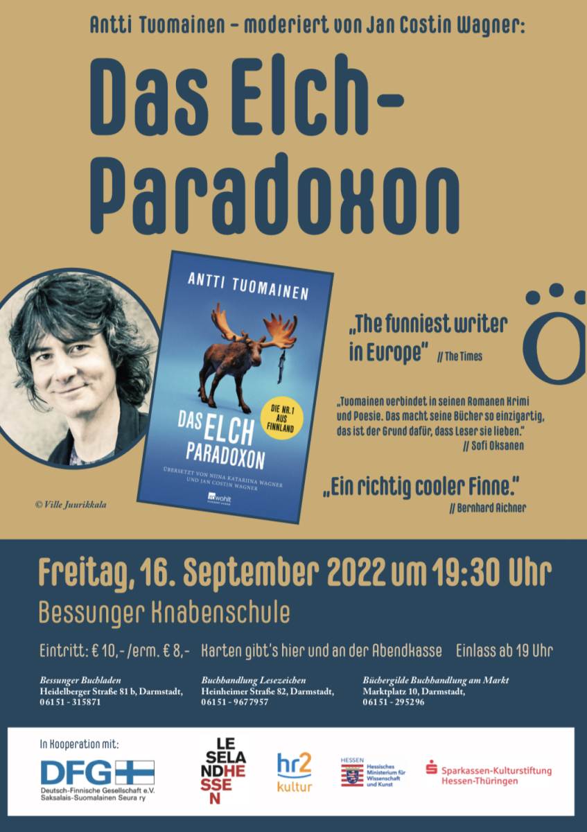 Der bekannte, finnische Autor Antti Tuomainen kommt am 16. September 2022 anlässlich der Veröffentlichung seines neuen Romans “Das Elchparadoxon” ins Darmstädter Kulturzentrum Bessunger Knabenschule, um aus seinem neuen Buch zu lesen. Durch den Abend führt der Tuomainen-Übersetzer und Autor der humorvollen Kriminalromane um den finnischen Kommissar Kimmo Joentaa, Jan Costin Wagner.