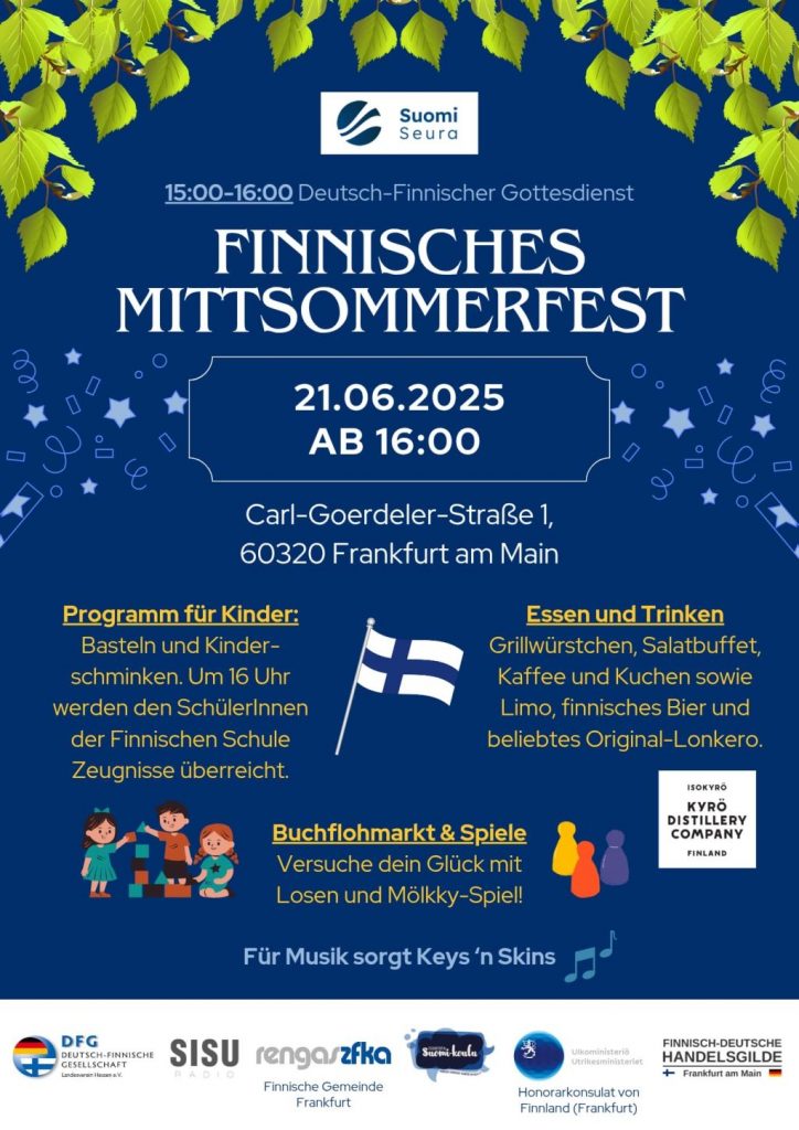 Am 21.06.2025 organisieren die Finnische Gemeinde, der Finnische Schulverein, die Deutsch-Finnische Handelsgilde, Sisu-Radio und die DFG Hessen mit Unterstützung des Finnischen Honorarkonsuls wieder eine gemeinsame Juhannus – Mittsommernachtsfeier auf dem Gelände der Dornbusch-Gemeinde, Carl-Goerdeler-Str. 1 in Frankfurt. Um 15 Uhr findet ein deutsch-finnischer Gottesdienst in der Kirche statt. Die Feier geht dann um 16 Uhr draußen los. Es tritt die Band Keys&Skins auf, auch mit Kinderprogramm. Bei der Juhannus-Feier wird gemeinsam gesungen, unterstützt von der Band. Es werden Kaffee, Kuchen, Grillwürstchen, Salat, Finnisches Bier, Original-Lonkero, sonstige Getränke angeboten. Wir spielen natürlich auch Mölkky.