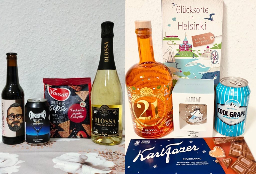 Du hast Dir noch nicht das offizielle Tasting-Paket geholt? Dann wird es höchste Zeit! Mit dabei sind diesmal weihnachtlich-prickelnder Blossa-Sekt, das offizielle “Amorphis”-Bier und ein ausgezeichnetes Craft-Bier, das Du so leicht in Deutschland nicht bekommen wirst. Dazu gibt’s leckere Roggenchips von Vaasan – ist das nicht unglaublich verlockend? Und das Beste ist: Wer das Paket bestellt, hat in der Liveshow die Chance, das obenabgebildete Suomi-Set zu gewinnen inklusive Blossa- Jahrgangsglögi, Mumin-Weihnachtskugel, Lonkero, Fazer-Pfefferkuchenschoki und einem Exemplar meines Buchs “Glücksorte in Helsinki”. Das alles im Gesamtwert von 45 Euro!