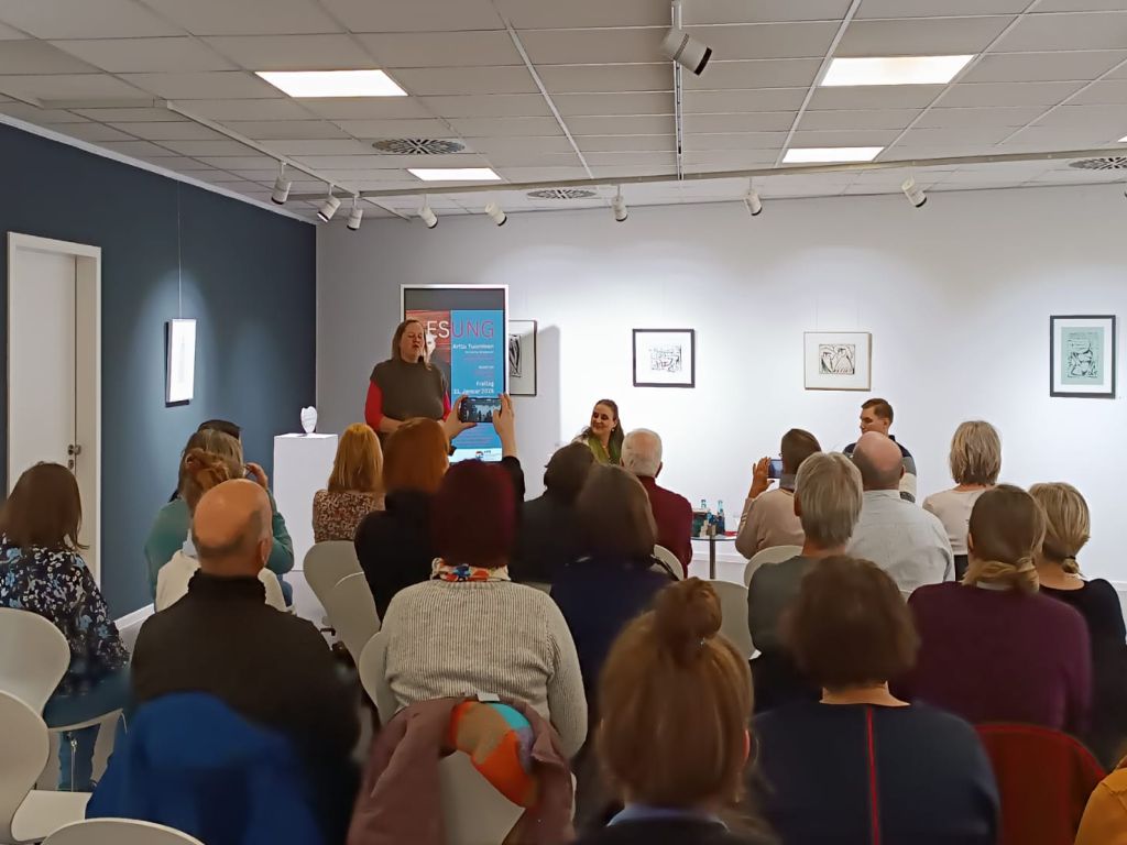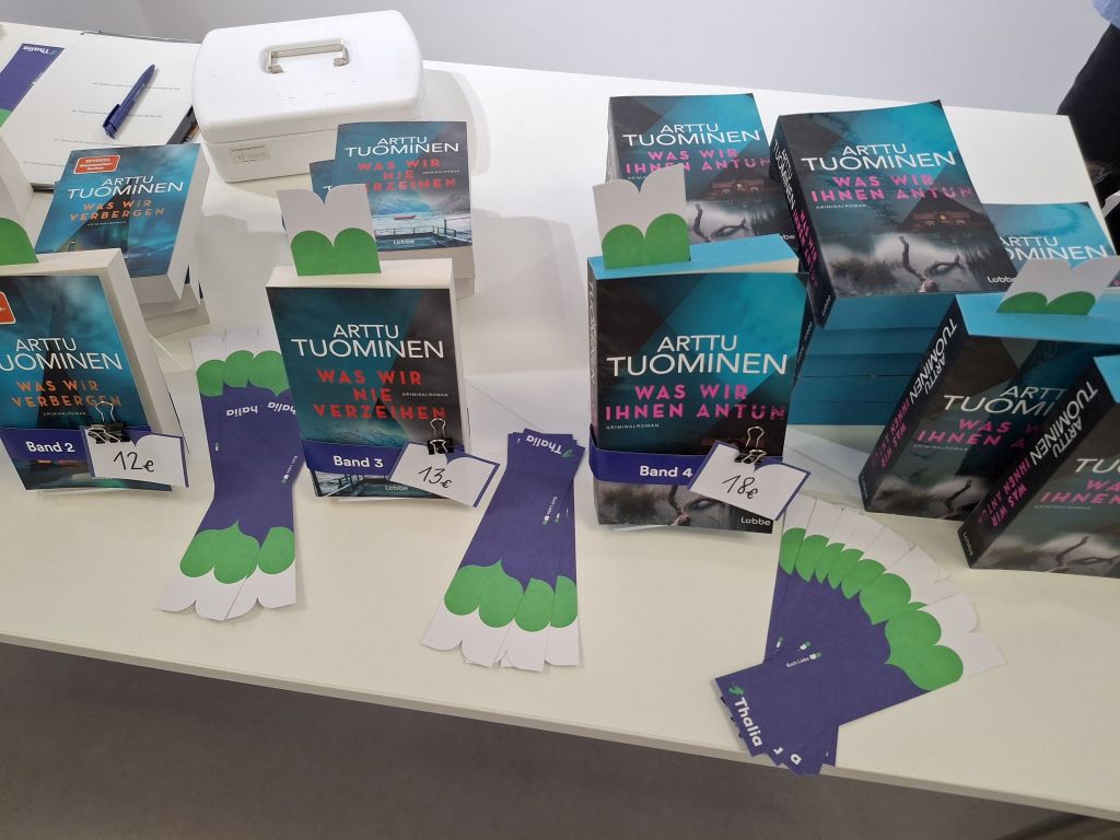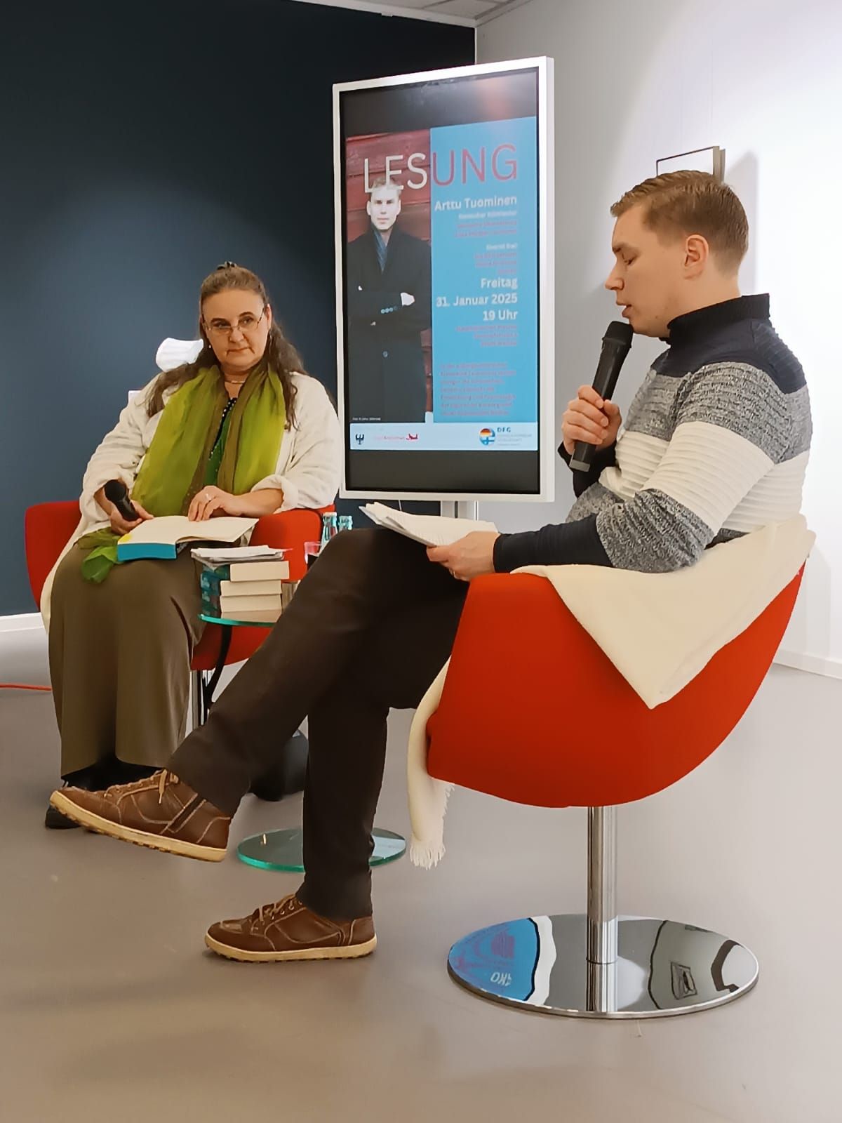 Nach der Begrüßung durch die Vorsitzende der Bezirksgruppe Gießen/Wetzlar, begann Anke Michler-Janhunen den Abend mit einem Interview, in dem sie Arttu Tuominen befragte, wie er zum Schreiben kam und was seine Bücher ausmacht. Anschließend wurde der Prolog des vierten Buches “Was wir ihnen antun” zunächst von Arttu auf finnisch vorgelesen und anschließend von Anke ins Deutsche übersetzt. Für einige Zuschauer war es dabei das erste Mal, dass sie die finnische Sprache hörten. In dem Buch geht es um die 13jährige Laura, die verschwindet und von ihrer Familie als vermisst gemeldet wird. Die Polizei geht zunächst nicht von einem Verbrechen aus, sondern glaubt, dass das Mädchen nur von zuhause weggelaufen ist. Erst als die Polizei Nachrichten eines “Peter Pans” auf Lauras Rechner findet, klingeln die Alarmglocken. Kurz danach wird das Mädchen tot aufgefunden. Natürlich wurde nicht verraten, wie sich die Geschichte entwickelt, ob es weitere Tote gibt und der Mörder gefasst wird.