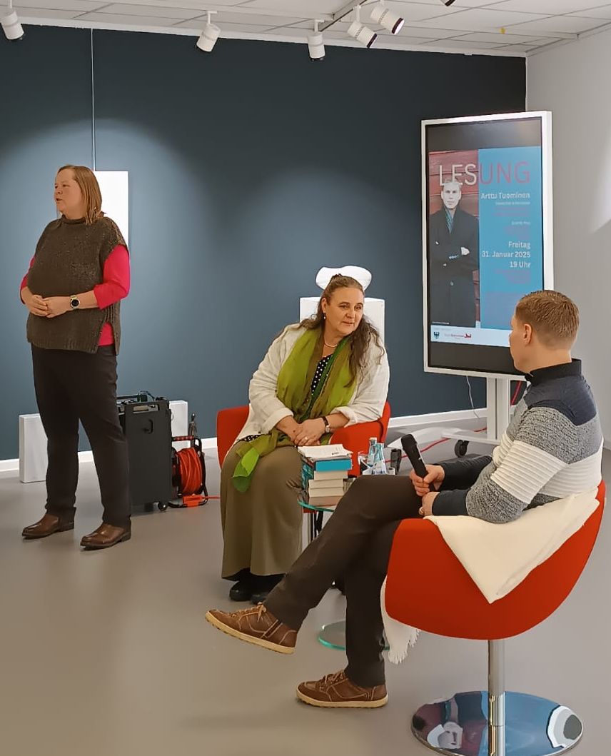 Arttu Tuominen, der derzeit erfolgreichste Krimiautor Finnlands, besuchte während seiner Tournee durch Deutschland als einzige Station in Hessen die Bezirksgruppe Gießen/Wetzlar. In Kooperation mit der Stadtbibliothek Wetzlar erwartete die Besucher ein spannender Abend mit interessanten Einblicken in das Leben und Schreiben eines bekannten Autors. Unterstützt wurde Tuominen durch Anke Michler-Janhunen, die den Abend moderierte und übersetzte.