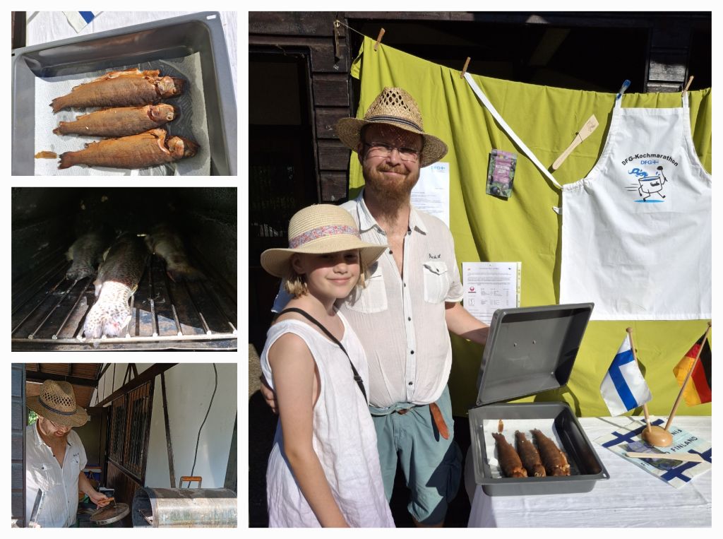 Nach dieser ersten Stärkung konnten wir uns dann dem Kochevent widmen. Den Anfang machten drei große Forellen, die in einem Räucherofen von Mika fachmännisch geräuchert wurden. Schon bald zog ein leckerer Duft über die Wiesen. Und geschmeckt haben sie super!