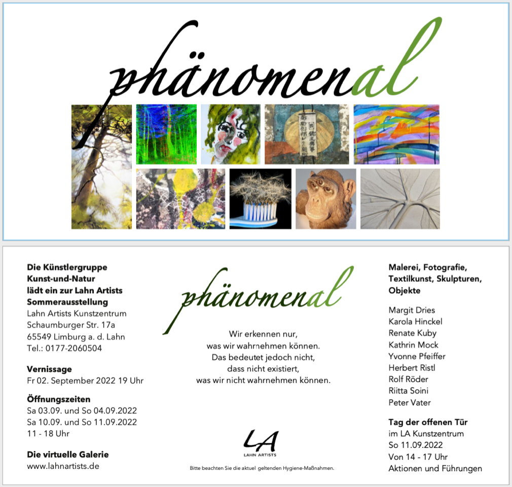 Am 2. September findet ab 19 Uhr im Lahn Artist Kunstzentrum (Schaumburgerstraße 17a) in Limburg die Eröffnung der Lahn Artists Sommerausstellung „phänomenal“ der Künstlergruppe Kunst-und-Natur statt.
