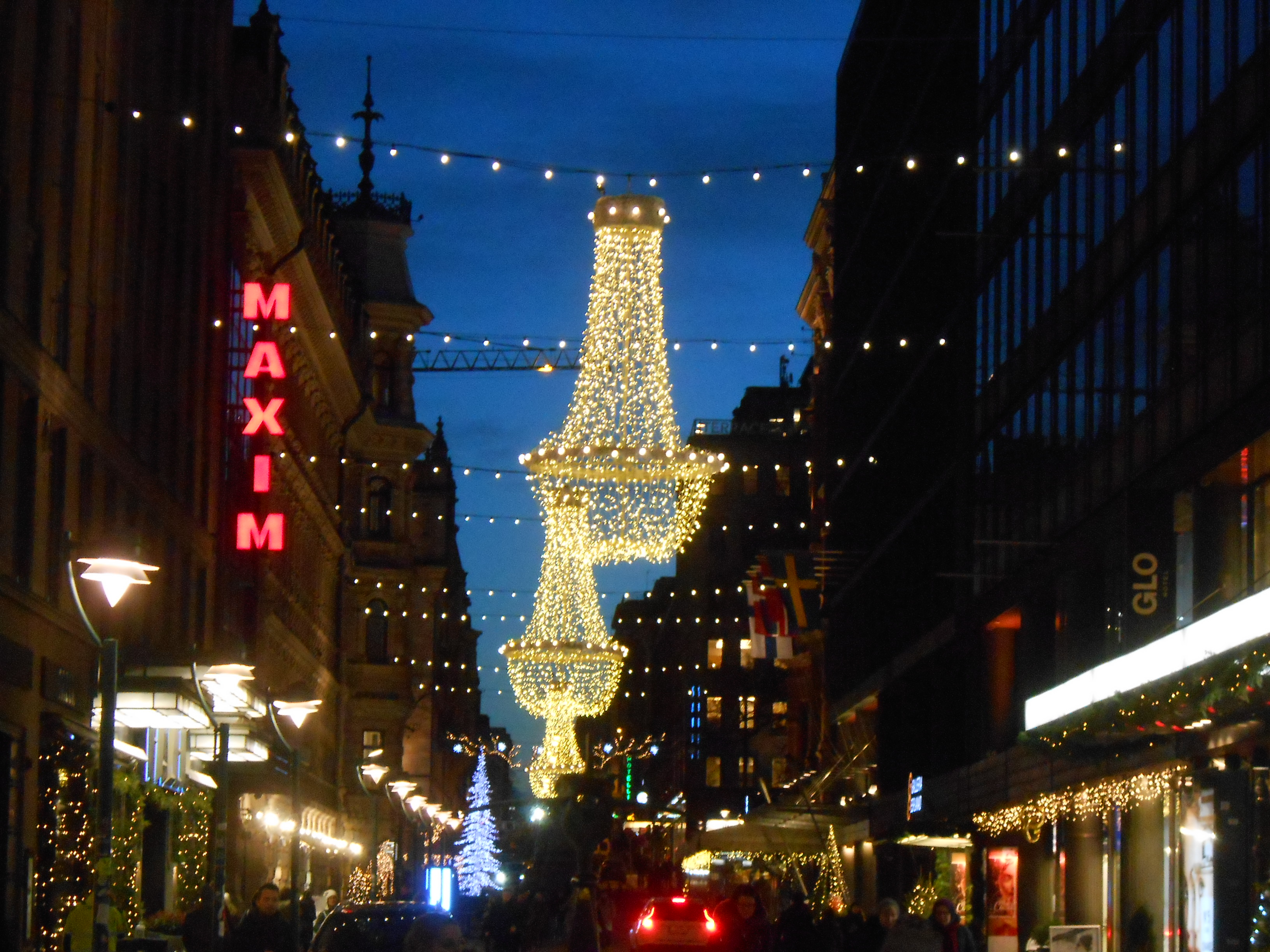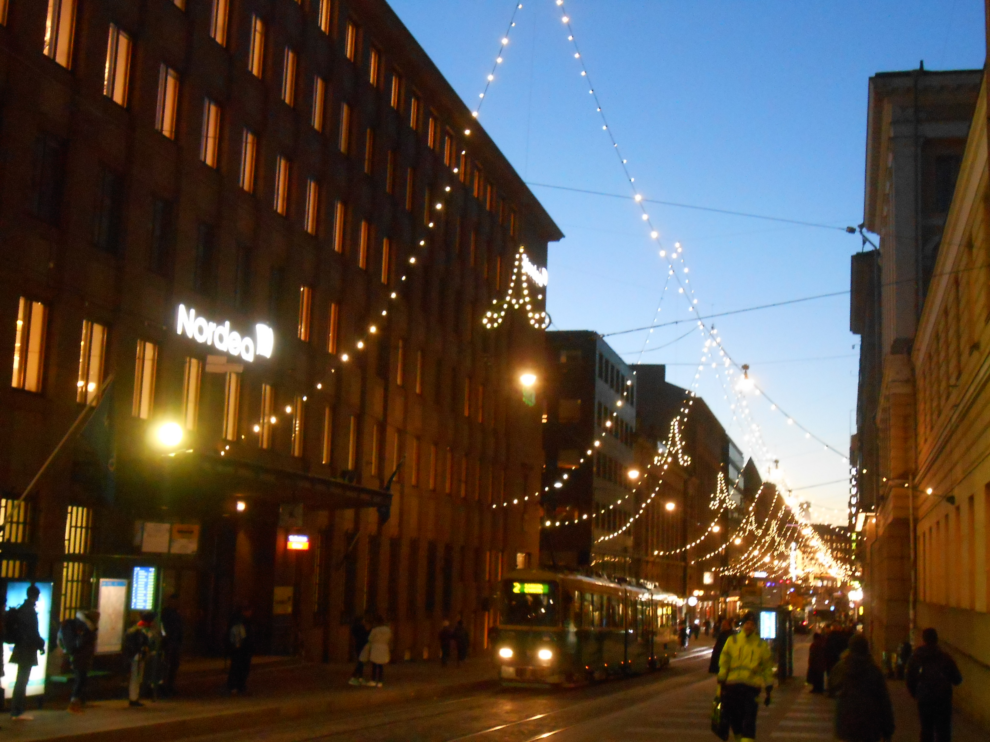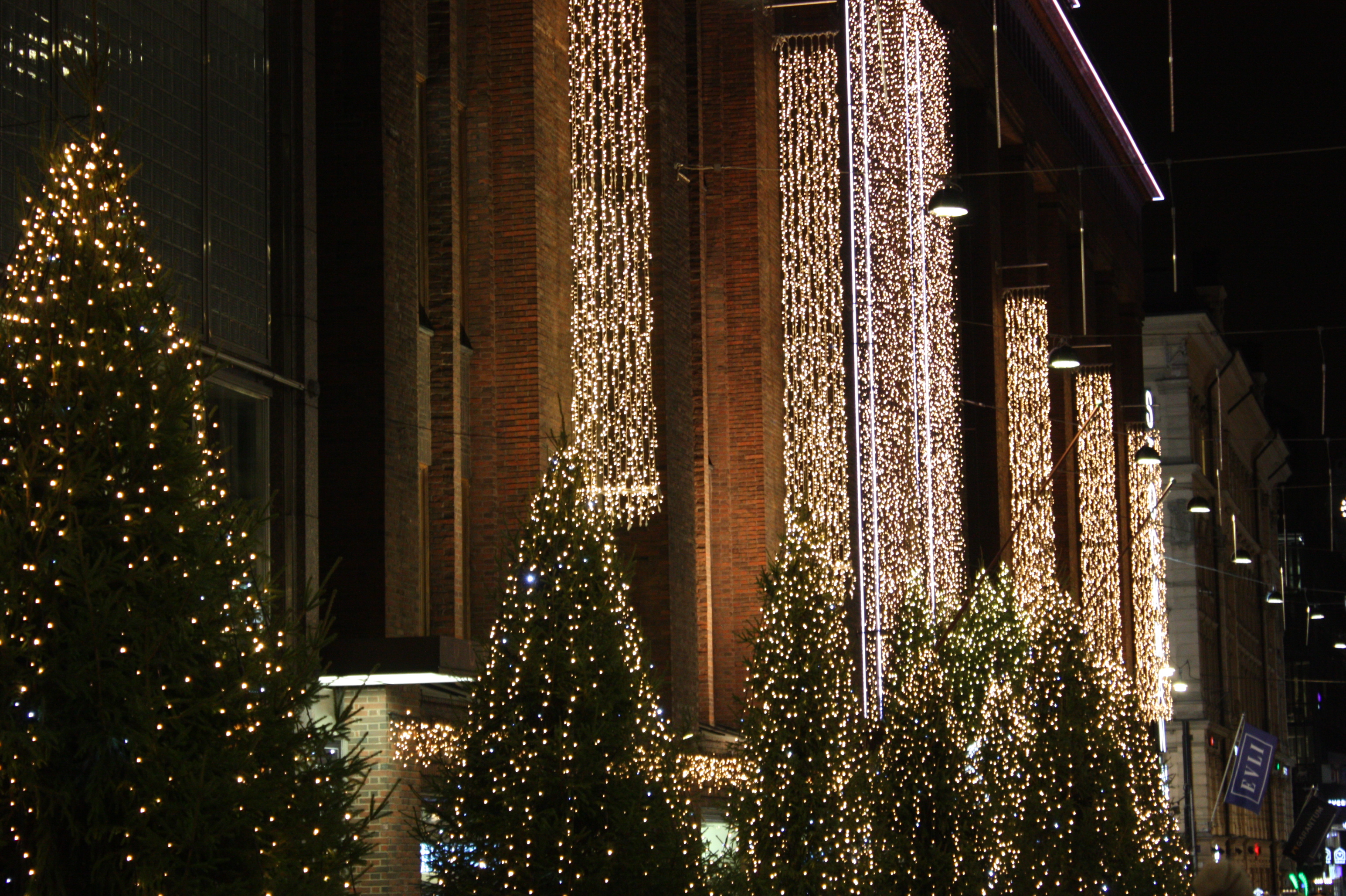 In der gesamten Innenstadt sind Weihnachtsbäume aufgestellt und die Hauptstraßen mit Lichterketten geschmückt. Vom Dom bis zum Bahnhof hängt in kurzen Abständen eine große Anzahl von “A’s” über der Straße, der Alexanderinkatu. Wenn es auch um 15 Uhr bereits anfängt zu dämmern und gegen 16 Uhr vollständig dunkel ist, tut das der guten Stimmung keinen Abbruch. Ganz im Gegenteil, die Weihnachtslichter leuchten dann noch viel heller und man kann die festliche Stimmung erst so richtig genießen.